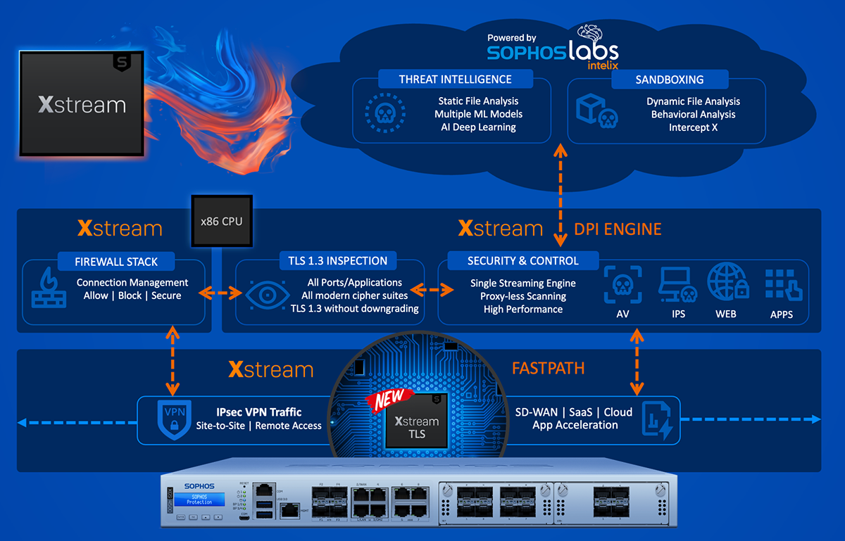 Sophos Firewall a introduit l’architecture Xstream pour la première fois dans la v18, mais elle a vraiment pris vie avec l’introduction des appliances de la série XGS avec des processeurs de flux Xstream dédiés pour l’accélération matérielle.