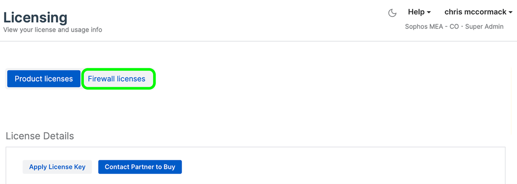 - Connectez-vous à votre compte Sophos Central et sélectionnez “Licences” dans le menu déroulant sous le nom de votre compte en haut à droite de la console Sophos Central.