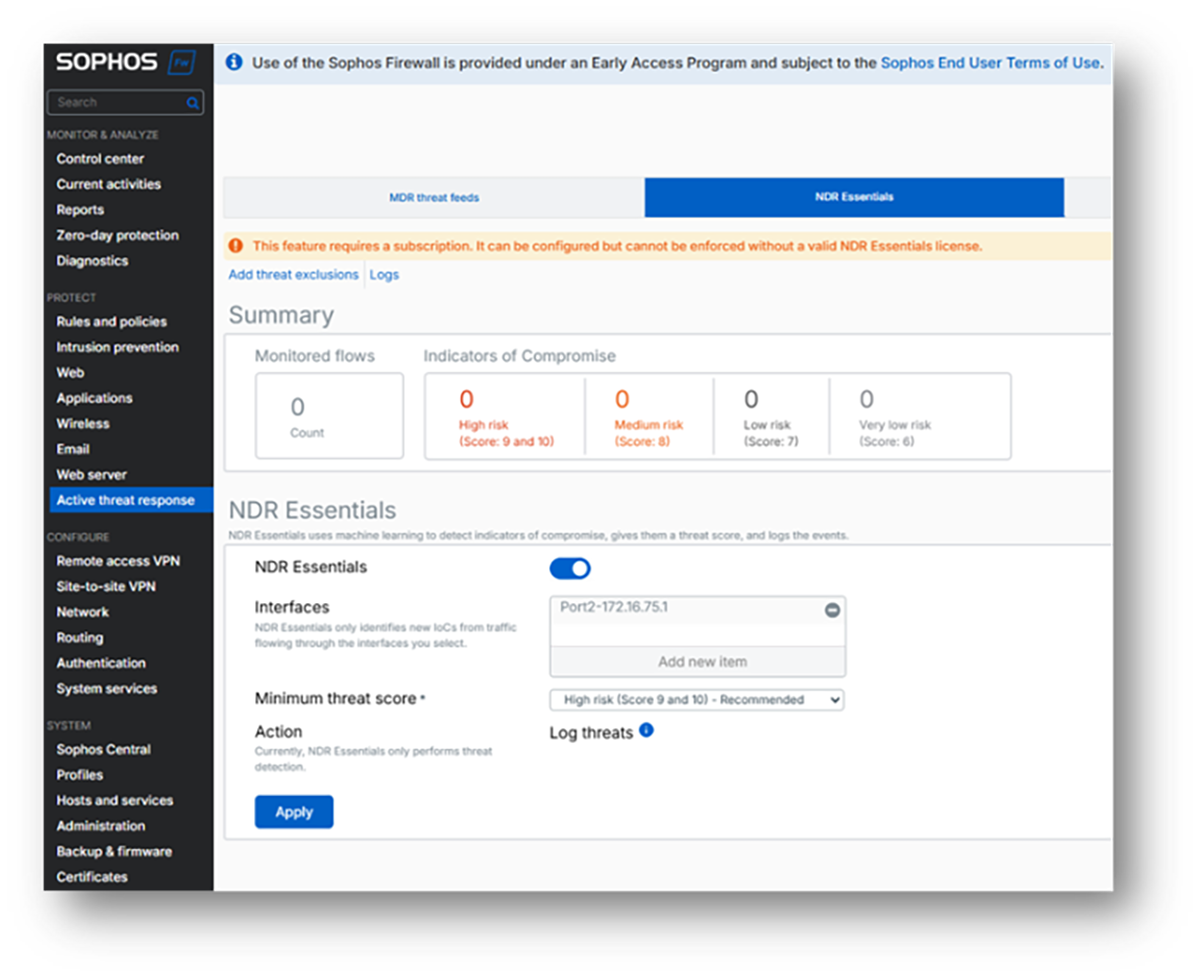 Sophos NDR Essentials offre une nouvelle couche de protection et, comme il est hébergé dans le Cloud par Sophos, il n’a aucun impact sur les performances de votre pare-feu, renforçant ainsi globalement les performances et la protection de pointe proposées par cette solution. Consultez le Guide des nouveautés pour obtenir plus de détails.