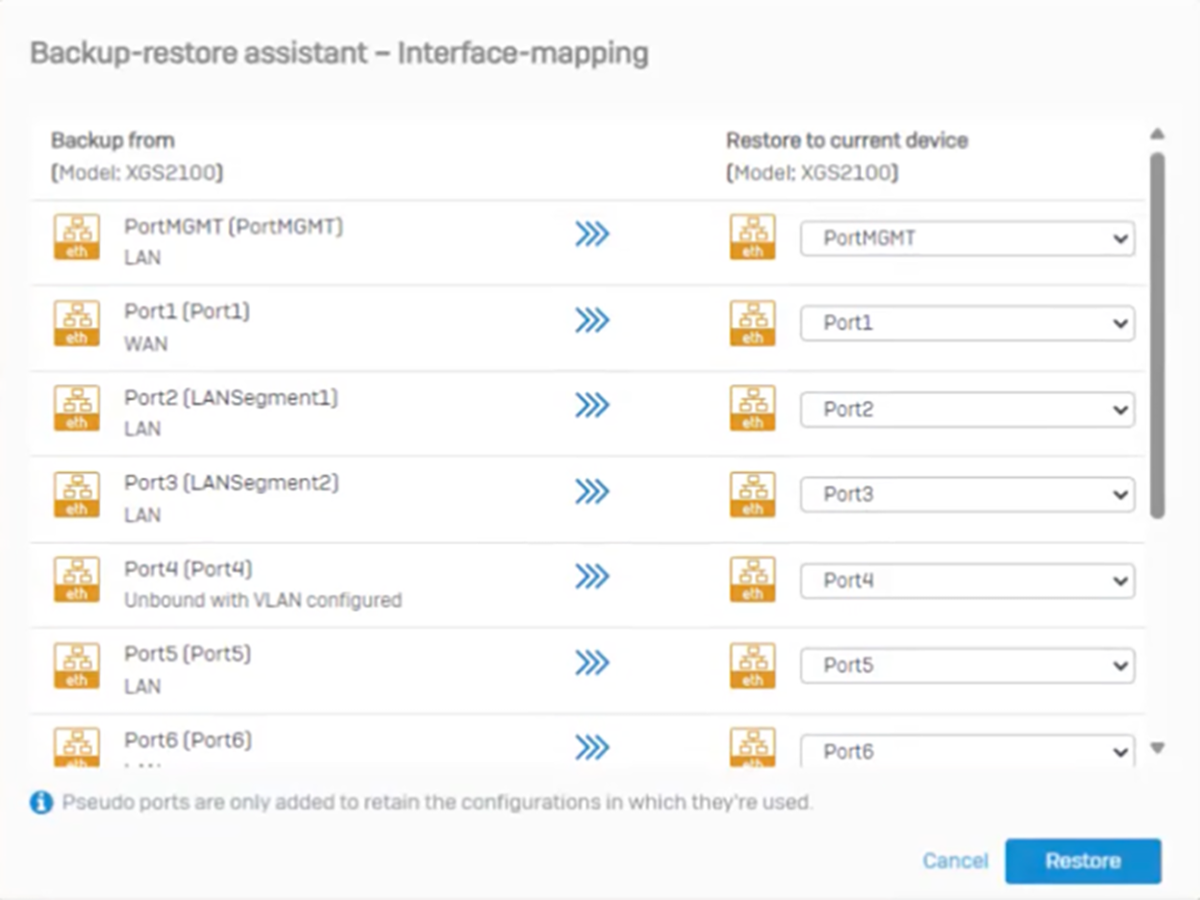 - Restaurez la sauvegarde de votre appareil de la série XG sur votre nouveau pare-feu à l’aide de l’assistant de mappage de ports.