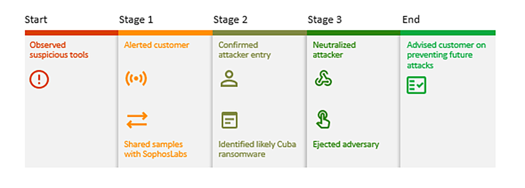 - En 30 minutes, les SophosLabs ont confirmé qu’un acteur malveillant avait eu accès à l’environnement du client et que les tactiques, techniques et procédures (TTP) adverses correspondaient aux premières étapes d’une attaque du ransomware Cuba.