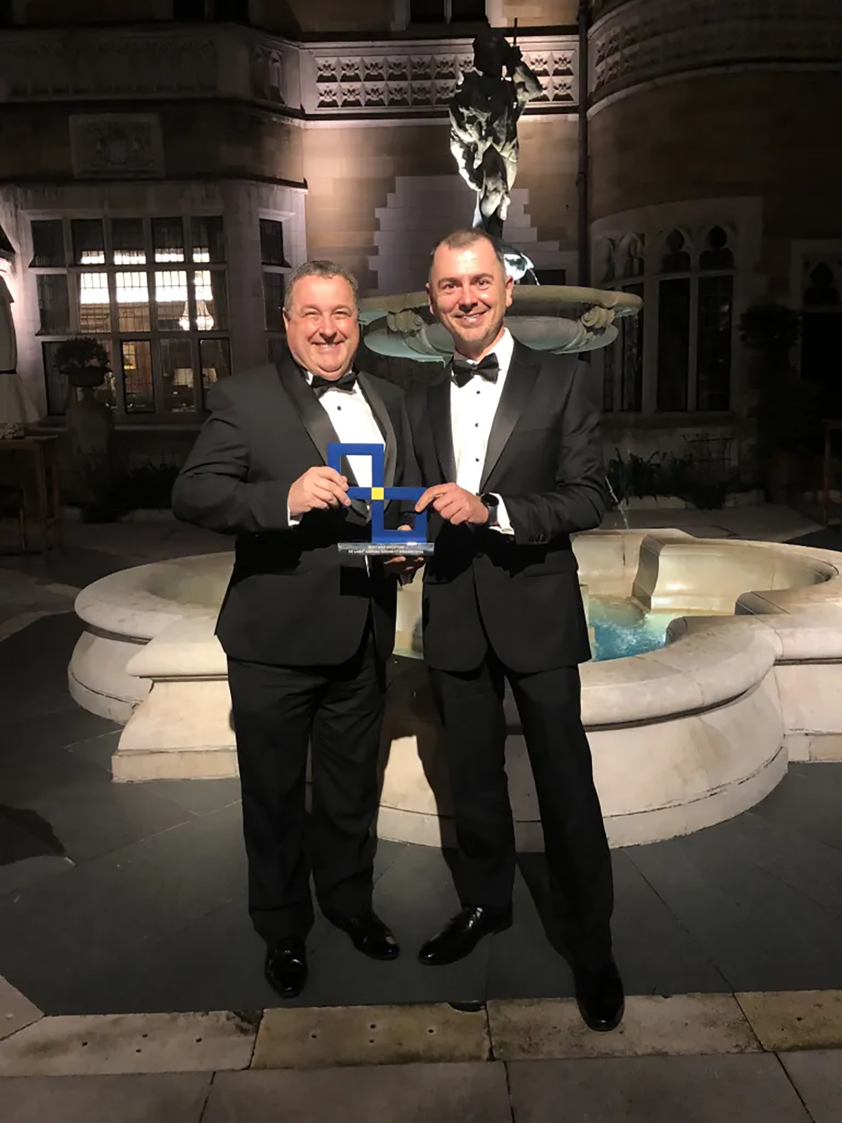 Scott Tyson (L), Sophos Director of Channel Sales – MSP EMEA, and Rob Harrison (R), Sophos SVP of Product Management – SecOps and Endpoint Security, en train de tenir dans leurs mains le prix SE Labs Best MSP.