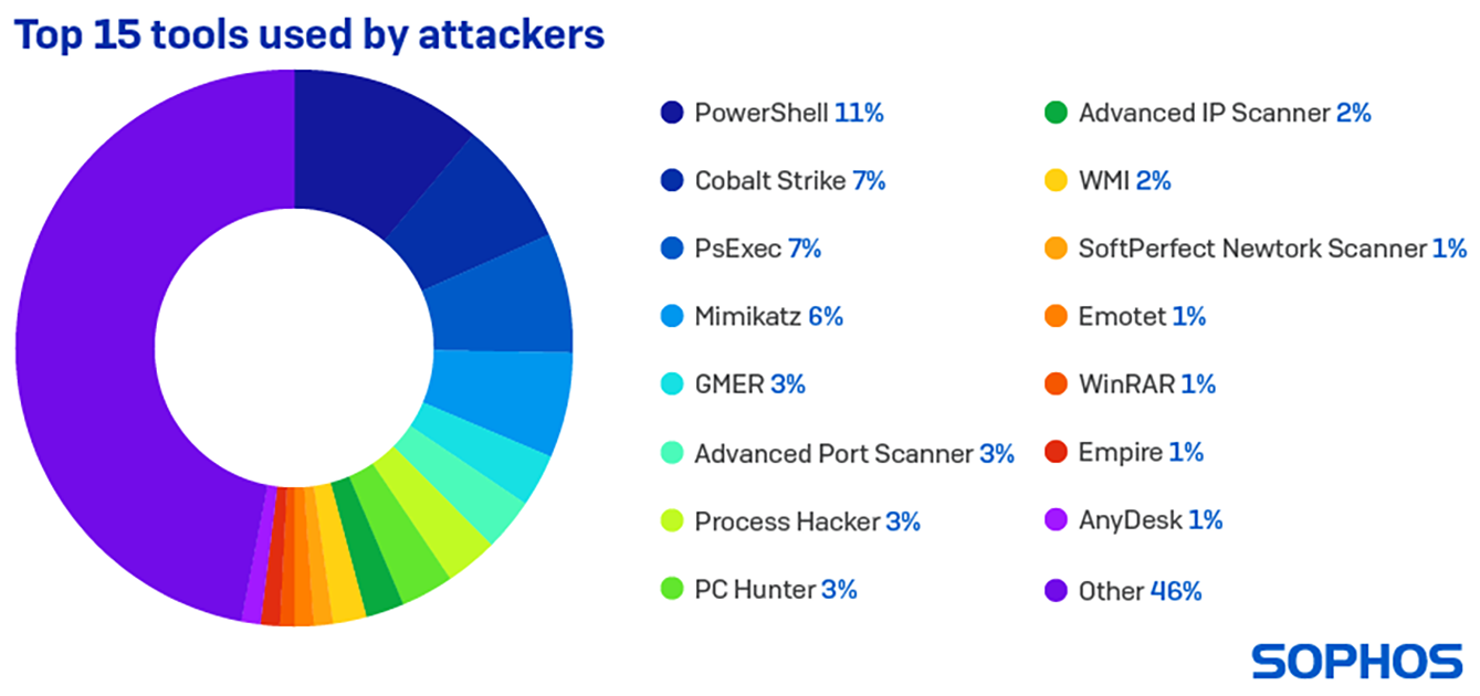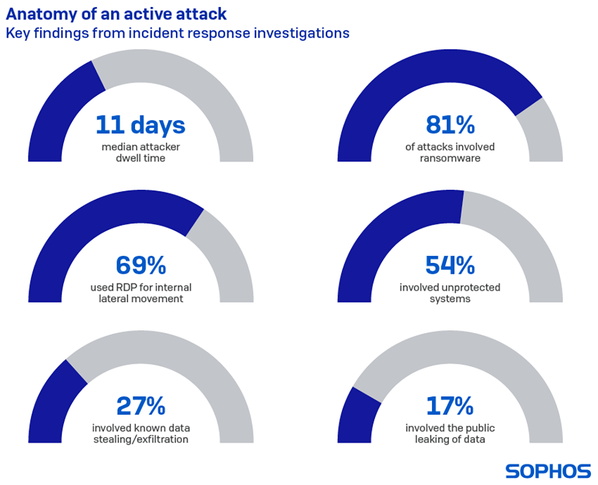 L’utilisation d’un ransomware est souvent le moment où une attaque devient vraiment visible pour l’équipe de sécurité IT. Il n’est donc pas surprenant que 81% des incidents auxquels Sophos a répondu impliquaient des ransomwares. Les attaques de ransomware ont tendance à avoir un temps de séjour plus court que les attaques cherchant à se dissimuler, car leur objectif est uniquement de détruire.