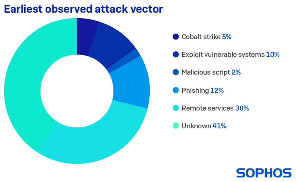 Les services d’accès à distance tels que le RDP (Remote Desktop Protocol) ont été impliqués lors du lancement de près d’une attaque sur trois (30%). Le phishing a été le point de départ d’environ une attaque sur huit (12%), suivi par l’exploitation de systèmes vulnérables dans environ une attaque sur 10.