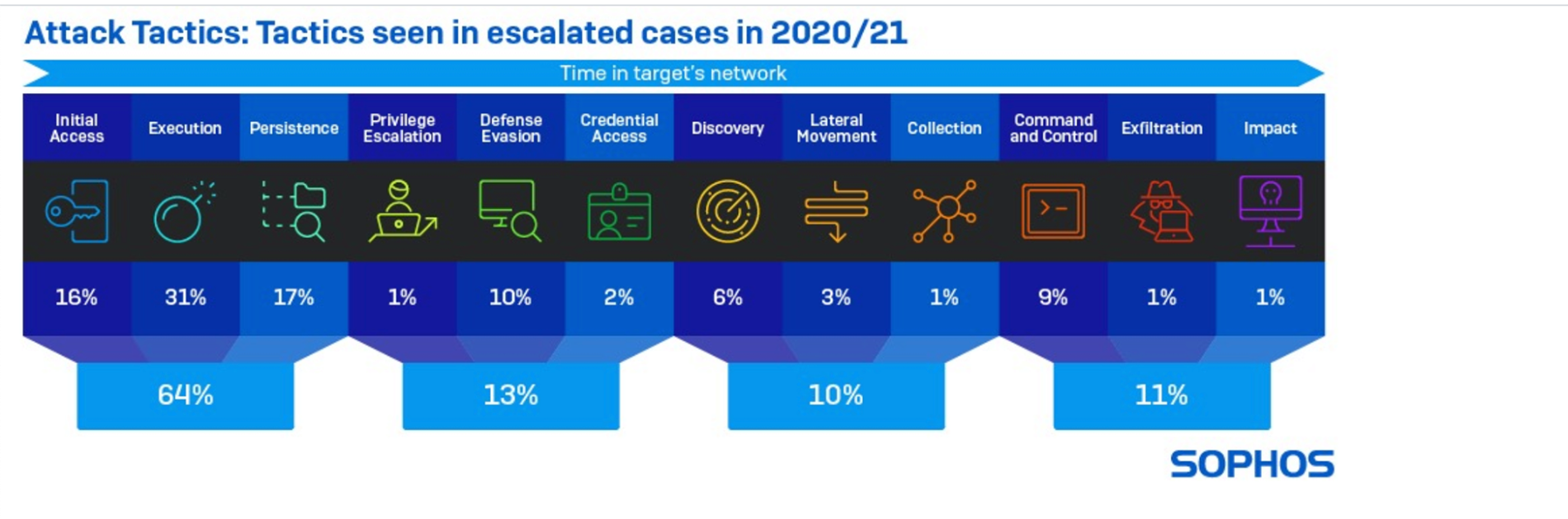 Il n’est donc pas surprenant que les tactiques de l’attaquant, les plus susceptibles de déclencher une investigation, soient fortement axées sur les activités qui ont lieu très tôt dans la chaîne d’attaque. Par exemple, sur toutes les tactiques remontées par Sophos MTR pour investigation, 31% étaient des détections suspectes de type “exécution“, 17% étaient des détections de type “persistance” et 16% étaient des détections de type “accès initial“.