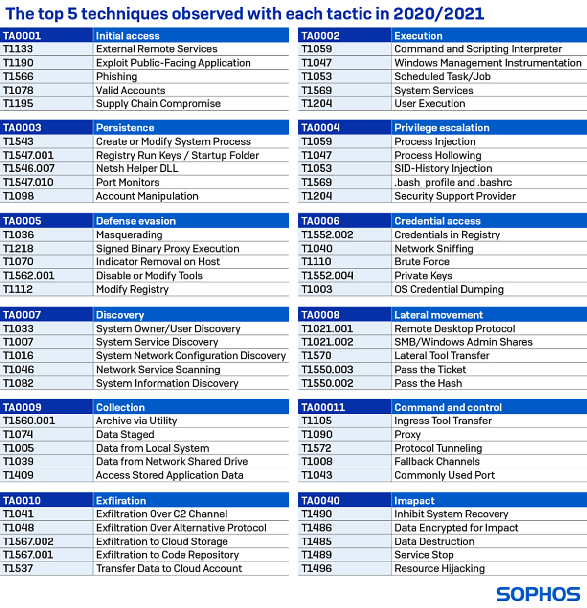 Les résultats sont basés sur les données de télémétrie Sophos ainsi que sur les rapports d’incidents et les observations des équipes Sophos Managed Threat Response (MTR) et Sophos Rapid Response en 2020 et début 2021. Les données sont classées par catégorie selon le framework MITRE ATT&CK.