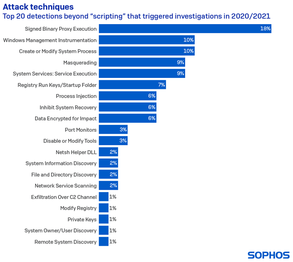 Après la création de scripts, nous trouvons dans cette liste des techniques qui impliquent l’exécution de contenu malveillant via un proxy avec des binaires signés (“détections de proxy binaire signé [signed binary proxy]”). Parmi toutes les détections qui ont déclenché des investigations, une sur six (18%) impliquait cette technique. Les détections de Windows Management Instrumentation occupaient la deuxième place, représentant 10% des investigations.
