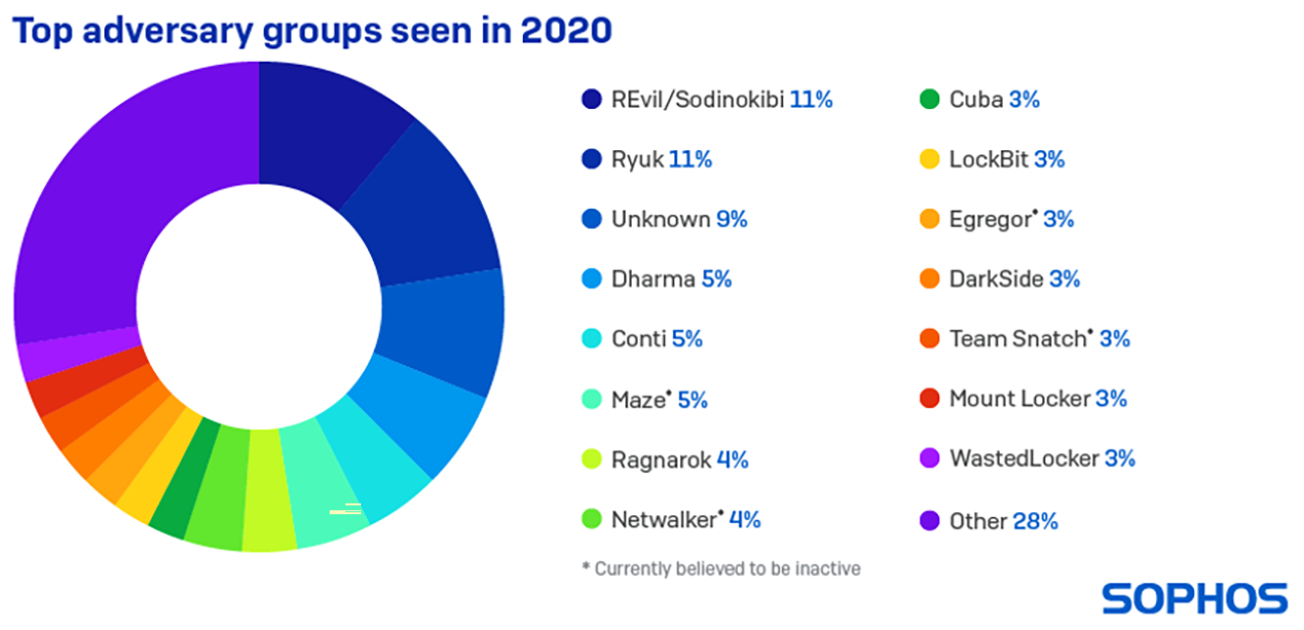 La liste des groupes d’attaque observés est dominée par les familles de ransomware, mais comprend également les cryptomineurs et les attaquants de type État-nation, entre autres. Dans certains cas, le groupe d’attaque impliqué est inconnu car l’attaque a été détectée et contenue avant la publication de la charge virale finale. En tout, 37 groupes d’attaque différents ont été identifiés, montrant ainsi clairement à quel point le paysage des cybermenaces est devenu très encombré et complexe et à quel point cette tendance peut très nettement compliquer la vie des défenseurs.