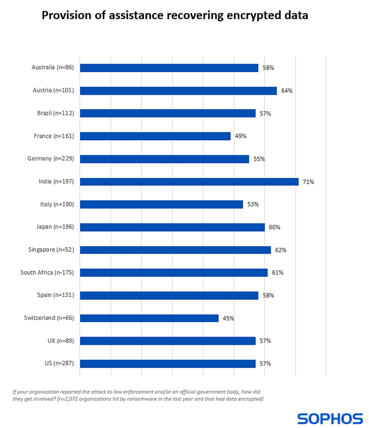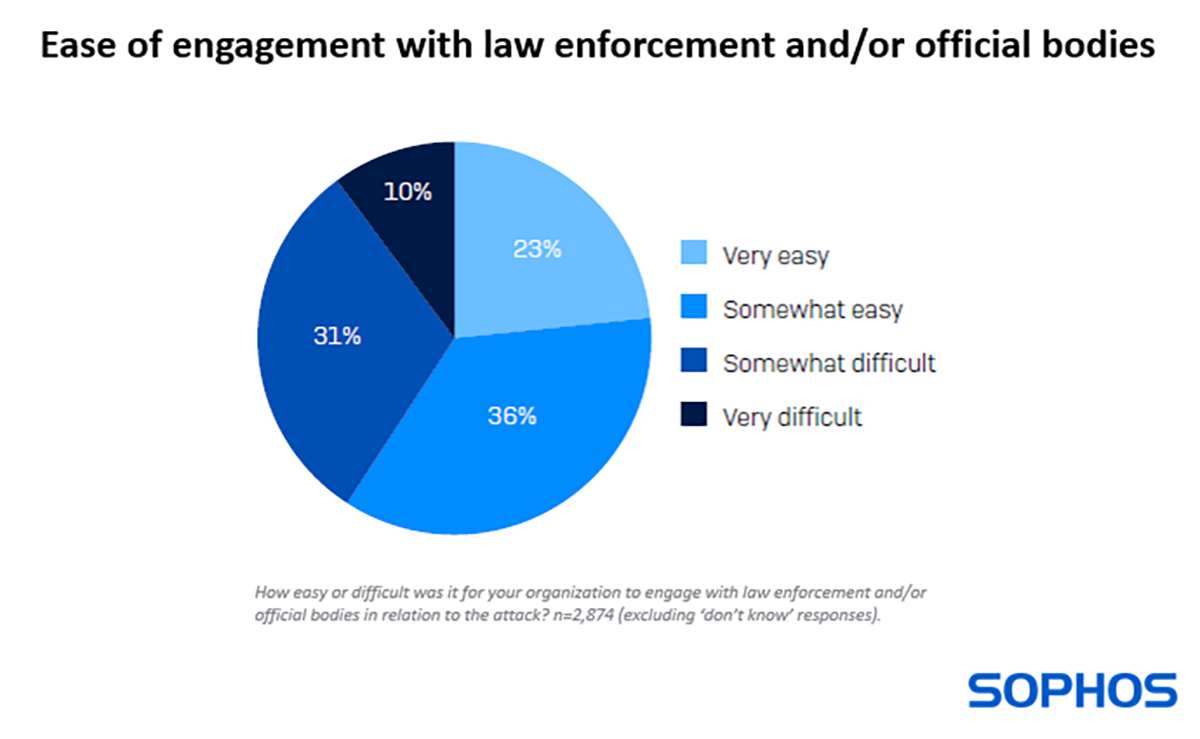 Pour les organisations qui signalent l’attaque, la bonne nouvelle est que les forces de l’ordre et/ou les organismes officiels sont presque toujours impliqués. Dans l’ensemble, seulement 1 % des 2 974 victimes interrogées ont déclaré n’avoir reçu aucune aide bien qu’elles aient signalé l’attaque.