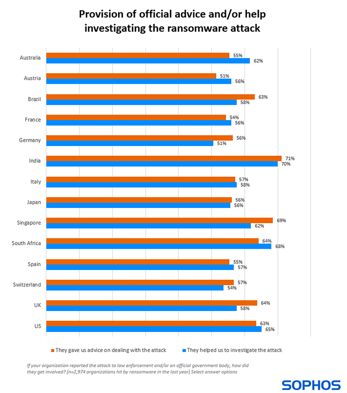 En détaillant un peu plus, nous constatons que la nature exacte de l’implication des forces de l’ordre et/ou des organismes officiels varie selon l’endroit où l’organisation est basée. Alors que plus de la moitié des victimes ont reçu des conseils pour faire face à l’attaque dans tous les pays étudiés, les organisations en Inde (71 %) et à Singapour (69 %) ont signalé le niveau d’aide le plus élevé dans ce domaine.