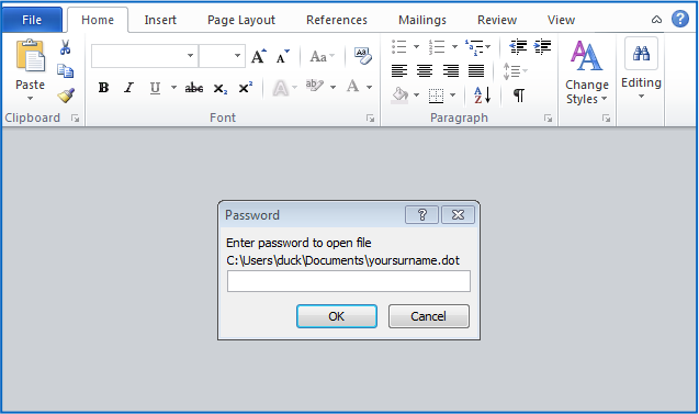 If you do open the attachment, which is portentously called Yoursurname.dot, Word prompts you for a password, just as the scammers warned you to expect: