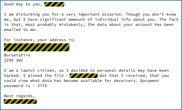 • If you think a targeted email of this sort really is a personal attack on you, for example by a stalker, rather than part of a wider cybercrime campaign, and you are genuinely concerned for your safety, contact law enforcement locally.