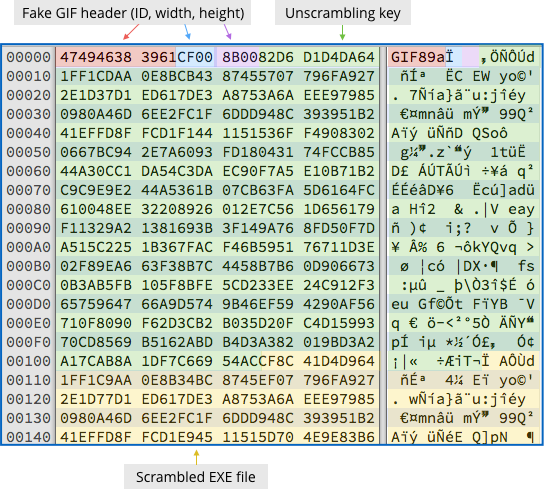 The GIF header makes the file look innocent, even though it won’t display as an image, and the Vigenère scrambling means that the suspicious parts of the file aren’t obvious.