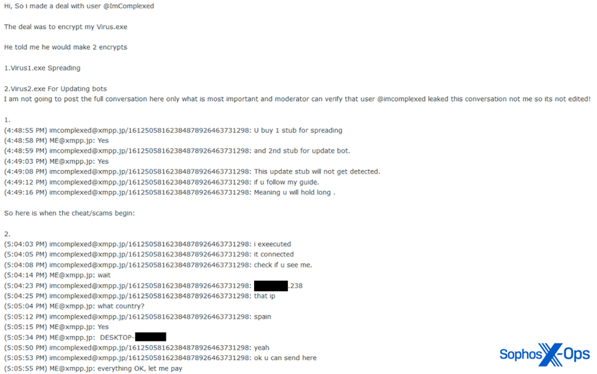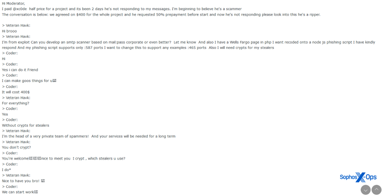 Les vendeurs ne mentionnent généralement pas les noms des victimes dans leurs listings AaaS, car ils craignent que les entreprises ne soient averties. Cependant, nous avons vu plusieurs exemples où les plaignants, victimes d’escroquerie, ont publié des logs de chat détaillés, comme celui ci-dessous, qui comprenait les noms des victimes.