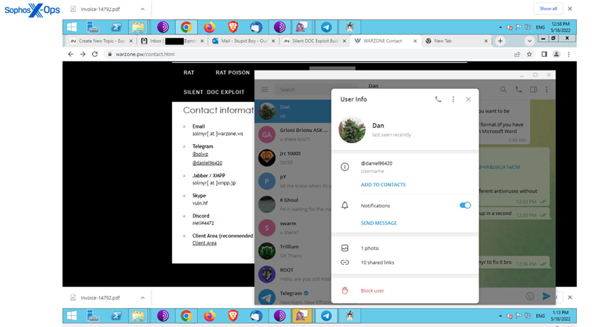 Certains rapporteurs de fraude sont particulièrement laxistes concernant la rédaction des informations. Dans un cas, un plaignant a téléchargé une série de captures d’écran (un exemple est présenté ci-dessous) contenant des informations sur les applications installées sur son système, la date et l’heure, son adresse email, son nom Outlook et les noms d’utilisateur d’autres personnes avec lesquelles il était en train de communiquer sur Telegram.