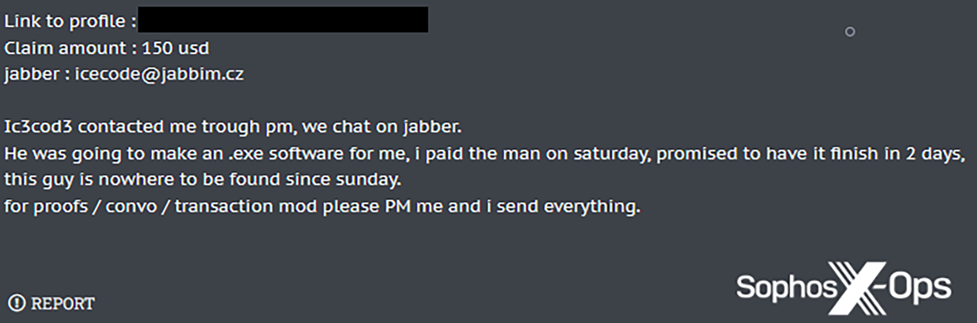 De nombreuses marketplaces cybercriminelles exigent des preuves lorsqu’une escroquerie est signalée, et les victimes ne sont que trop heureuses de les transmettre. Alors qu’une minorité de rapporteurs masquent ces preuves ou bien les restreignent pour qu’elles ne soient visibles que par un modérateur, la plupart ne le font pas, et donnent accès à des informations très précieuses telles que des adresses de crypto-monnaie, des identifiants de transaction, des adresses email, des adresses IP, des noms de victime, du code source, et bien plus encore.