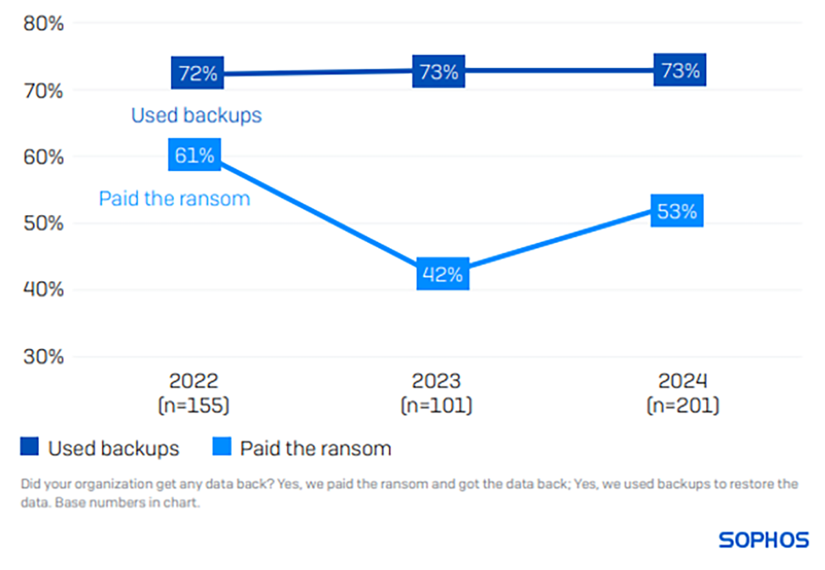 Alors que 73% des établissements de santé ont restauré des données chiffrées à l’aide de sauvegardes, 53% ont payé la rançon pour récupérer les données. En comparaison, globalement, 68% des personnes interrogées ont utilisé des sauvegardes et 56% ont payé la rançon.