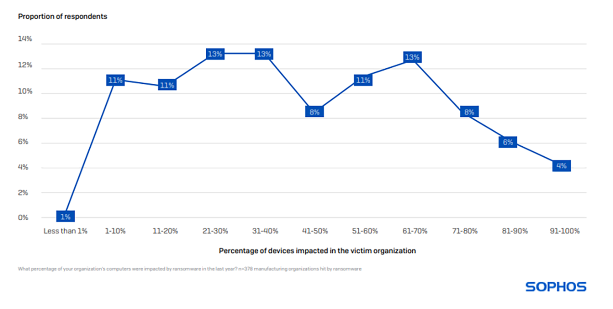 En moyenne, 44 % des ordinateurs du secteur manufacturier sont touchés par une attaque de ransomware. Un chiffrement malveillant complet de l’environnement est extrêmement rare, puisque seulement 4 % des entreprises déclarent que 91 % ou plus de leurs appareils ont été affectés.