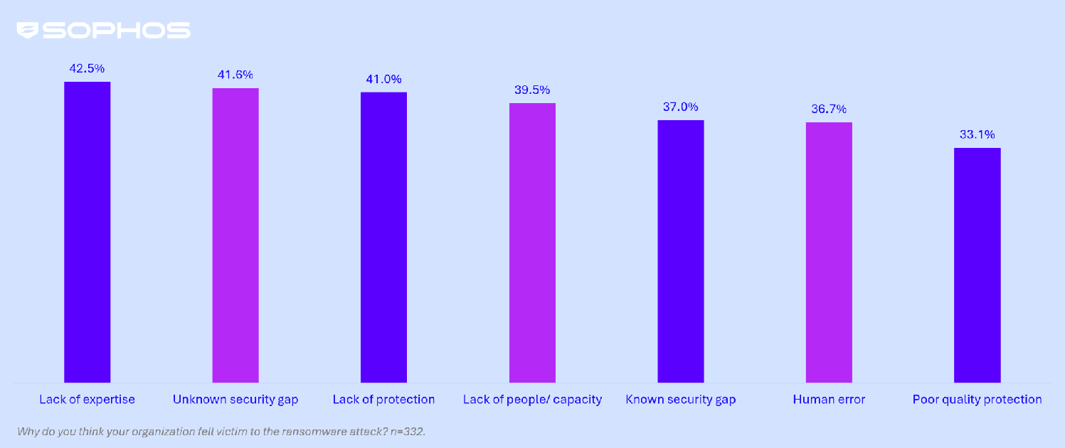 De multiples facteurs organisationnels contribuent à ce que les entreprises du secteur manufacturier soient victimes de ransomware, le plus courant étant un manque d’expertise (c’est-à-dire des compétences ou des connaissances insuffisantes pour détecter et stopper l’attaque à temps), cité par 42,5% des victimes. Il est suivi de très près par les failles de sécurité inconnues (c’est-à-dire des vulnérabilités dans les défenses que les personnes interrogées ignoraient complètement) qui ont contribué à 41,6% des attaques.