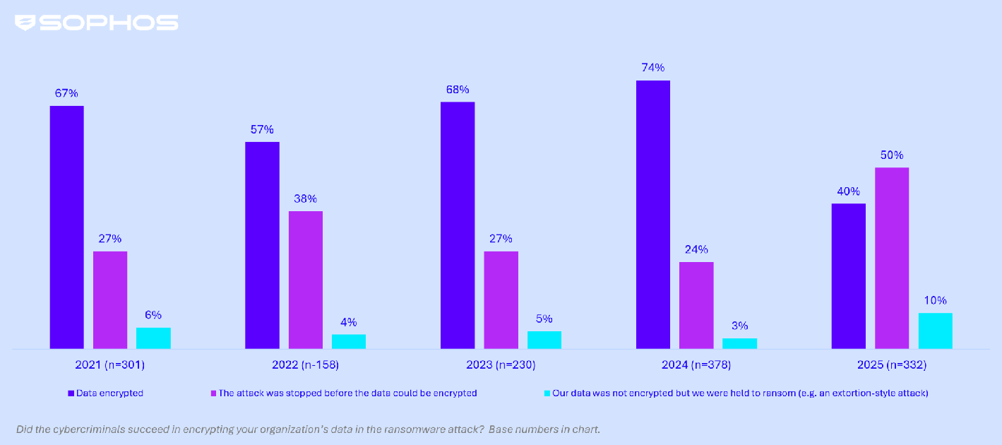 Cependant, les adversaires s’adaptent : la proportion d’organisations de ce secteur touchées par des attaques d’extorsion uniquement (où les données n’étaient pas chiffrées mais où une rançon avait tout de même été exigée) a grimpé en passant à 10% des attaques en 2025, contre seulement 3% en 2024. Il s’agit du deuxième taux le plus élevé enregistré dans l’enquête de cette année. Cette évolution est probablement due à la valeur élevée de la propriété intellectuelle, à la complexité de la supply chain et à l’impact opérationnel des temps d’arrêt dans les environnements liés à la fabrication et production.