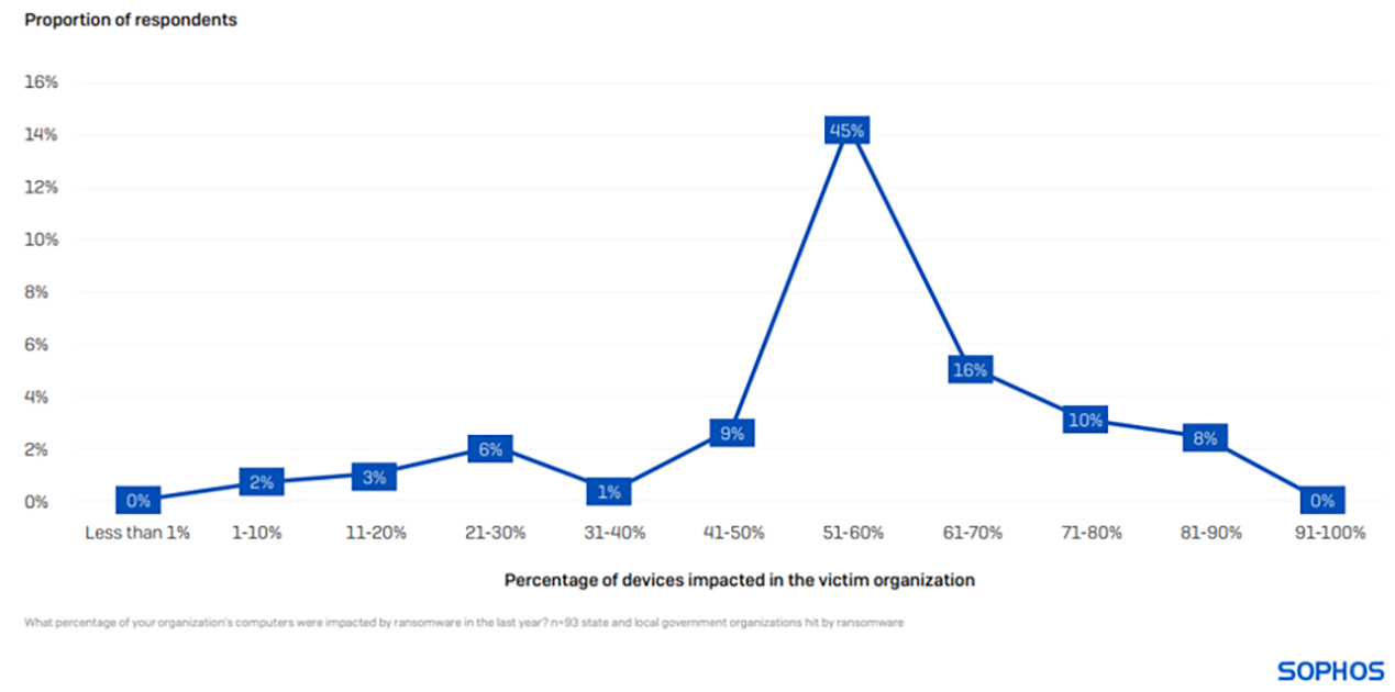 En moyenne, 56% des ordinateurs des organismes de ce secteur ont été touchés par une attaque de ransomware, soit un taux supérieur à la moyenne intersectorielle de 49 %. Un chiffrement malveillant complet de l’environnement est extrêmement rare, puisque seulement 8% des organisations déclarent que 81% ou plus de leurs appareils ont été affectés.