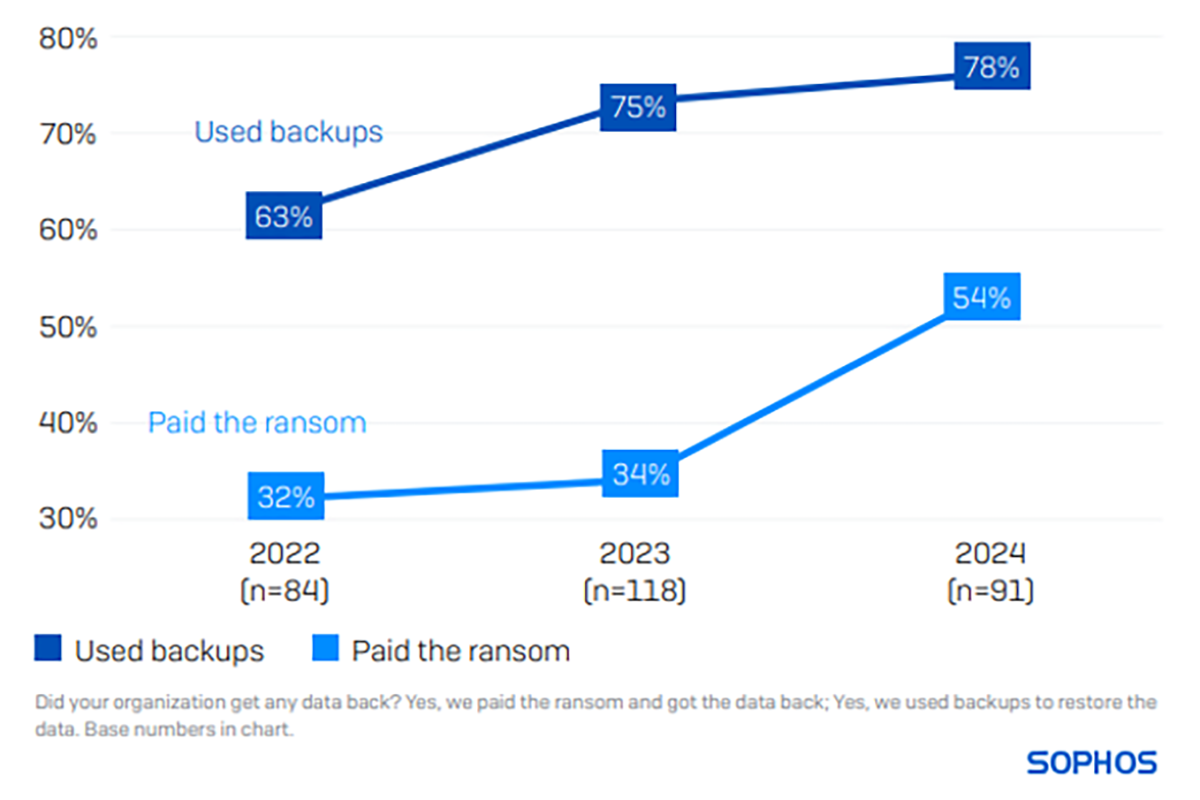 Il est important de souligner que depuis un an, la tendance des victimes à recourir à plusieurs méthodes de récupération des données chiffrées (paiement de la rançon et utilisation de sauvegardes, par exemple) s’est considérablement renforcée. Dans l’étude de cette année, 44% des organismes de ce secteur dont les données étaient chiffrées ont déclaré utiliser plus d’une méthode, soit quatre fois le taux signalé en 2023 (11%).
