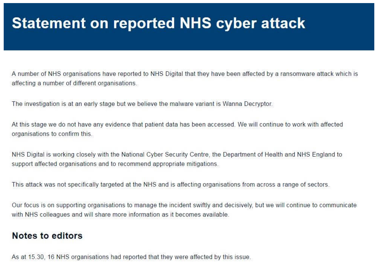 National Health Service hospitals (NHS) in the UK suffered the brunt of the attack early on, with its phone lines and IT systems being held hostage. NHS Digital posted a statement on its website: