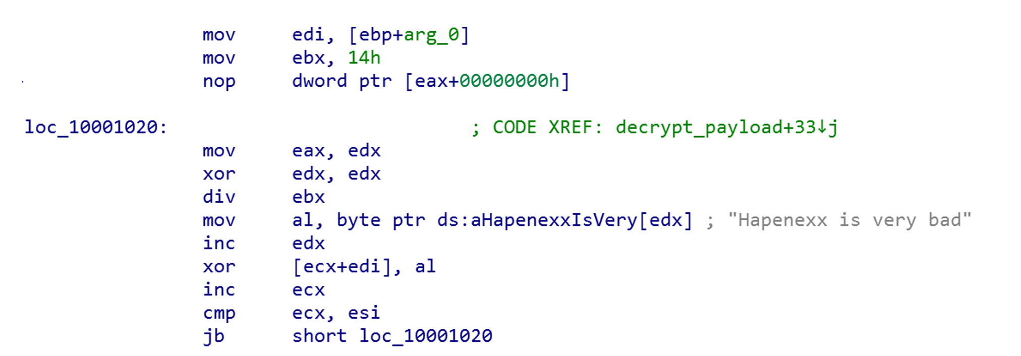 The encryption is simple XOR algorithm, where the key is the following string: Hapenexx is very bad