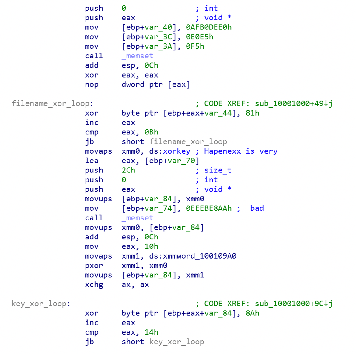 It uses the same payload name (Groza_1.dat) and password (Hapenexx is very bad) as the first case, only this time both the file name and the decryption key are themselves encrypted with a one-byte XOR algorithm.