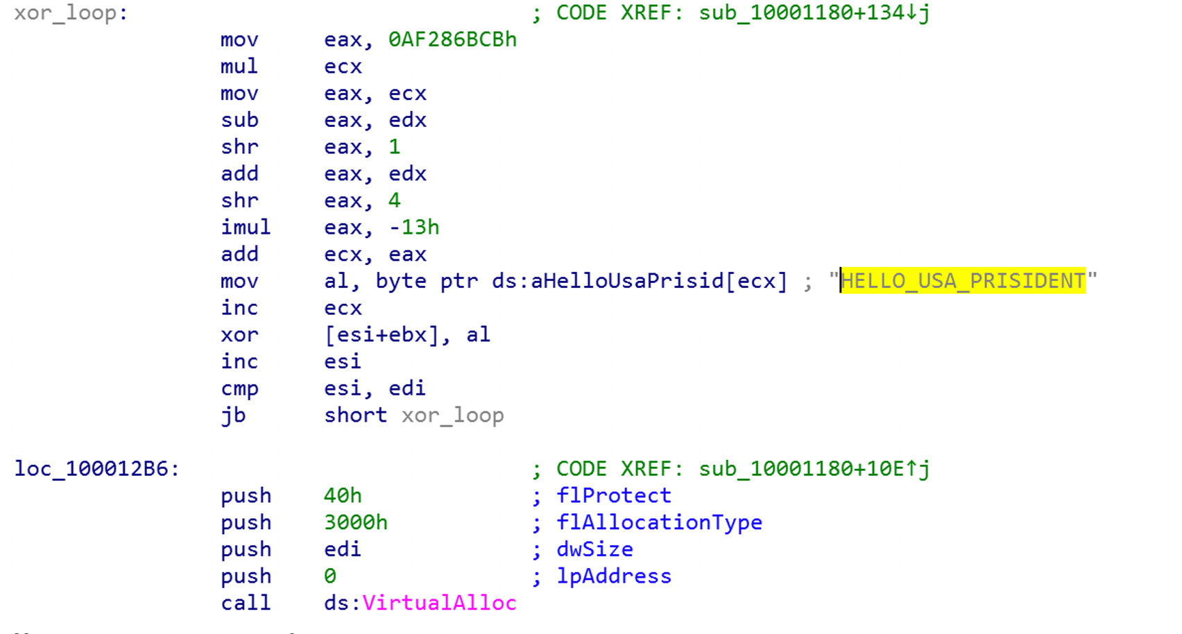 The malicious loader loads the payload from the file named adobe.dat, and uses a similar XOR decryption to that used in Scenario 1. The only significant difference is the encryption key, which in this case is the string HELLO_USA_PRISIDENT.
