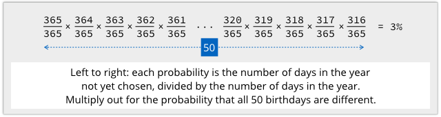 That comes out at 3%, meaning that with 50 people, the chance that at least two people share a birthday is (100% – 3%), or an amazing 97%.