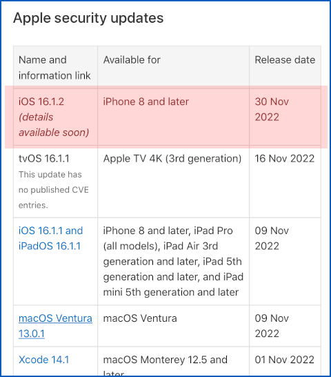 iOS 16.1.2 (details available soon) – iPhone 8 and later – 30 Nov 2022
