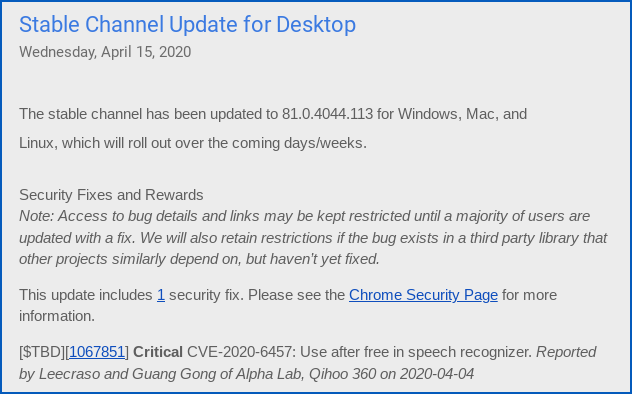 Curiously, despite a bug that’s critical enough to imply that it is exploitable and that exploiting it could let a crook implant malware on your computer, Google advises that the new version “will roll out over the coming days/weeks.”