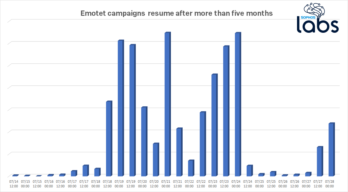 The sudden disappearance of the malware gave rise to a lot of rumors that the creators had been arrested, or contracted COVID-19, or simply had retired and planned to live the good life on the Black Sea coast. But these theories were squashed on July 17th, when we saw a new wave of Emotet attacks swing back into action.