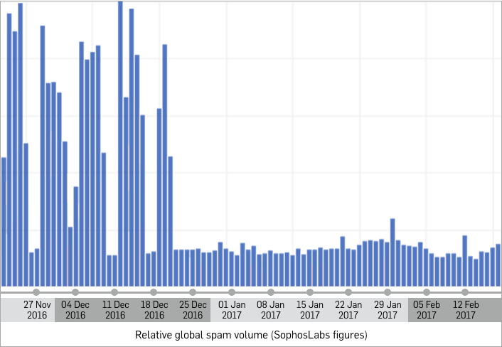 The chart below represents the spam levels seen in the Sophos spamtrap network, plotted daily, going back to the end of November 2016: