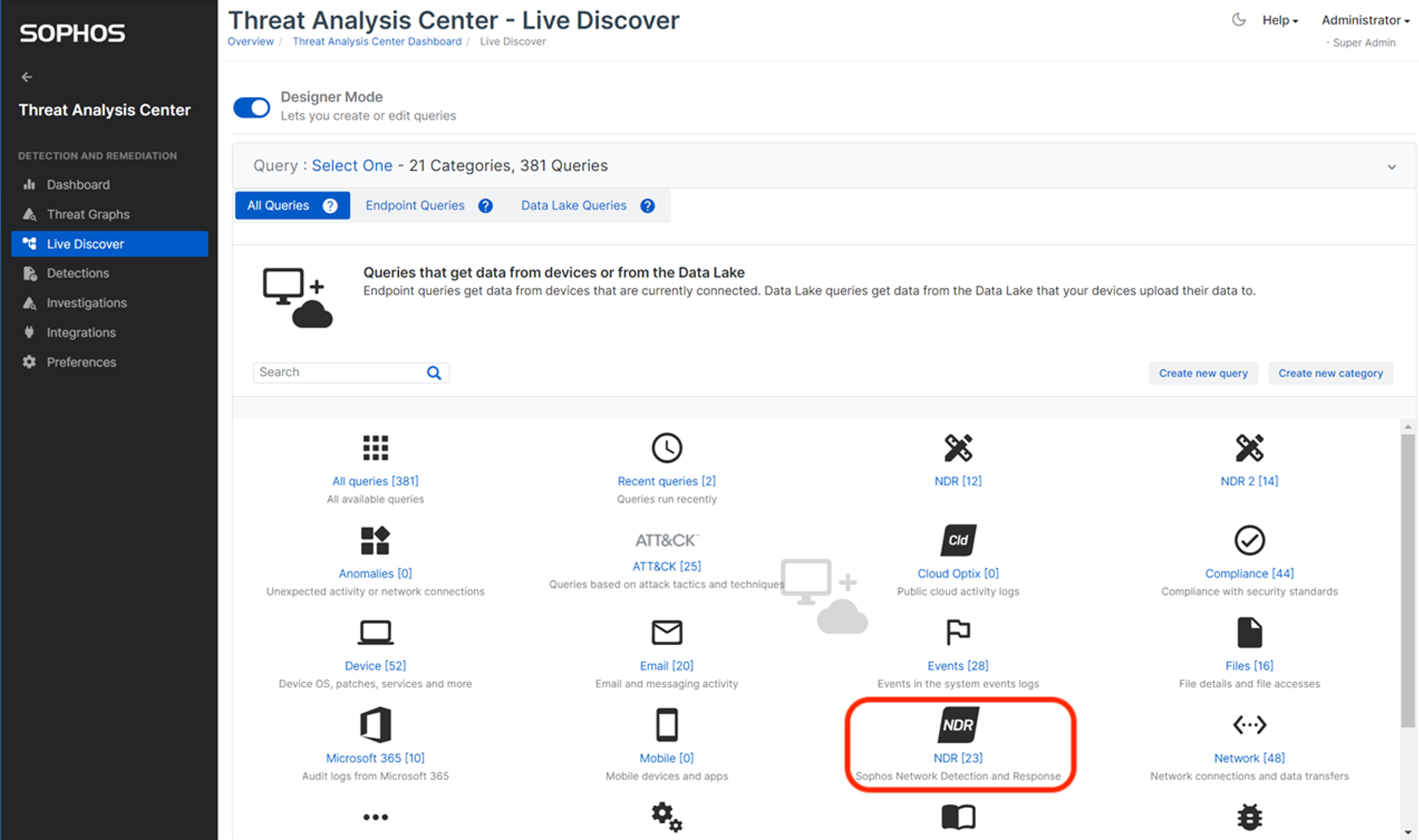 Le nuove query e i relativi report NDR sono disponibili nella sezione Live Discover del Threat Analysis Center di Sophos Central, e possono essere eseguiti su richiesta o configurati per essere utilizzati in modo programmato.