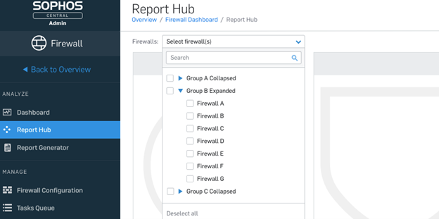 Reporting is also more accessible in Sophos Central, with two new direct main menu options under Firewall Management for the Report Hub Dashboard and the Report Generator tools.
