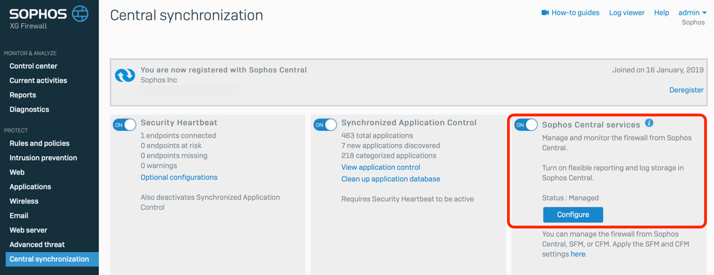Setup is easy: simply log into the firewall and select “Central Synchronization” from the main menu to add a firewall to Sophos Central. Then log into Sophos Central to confirm.