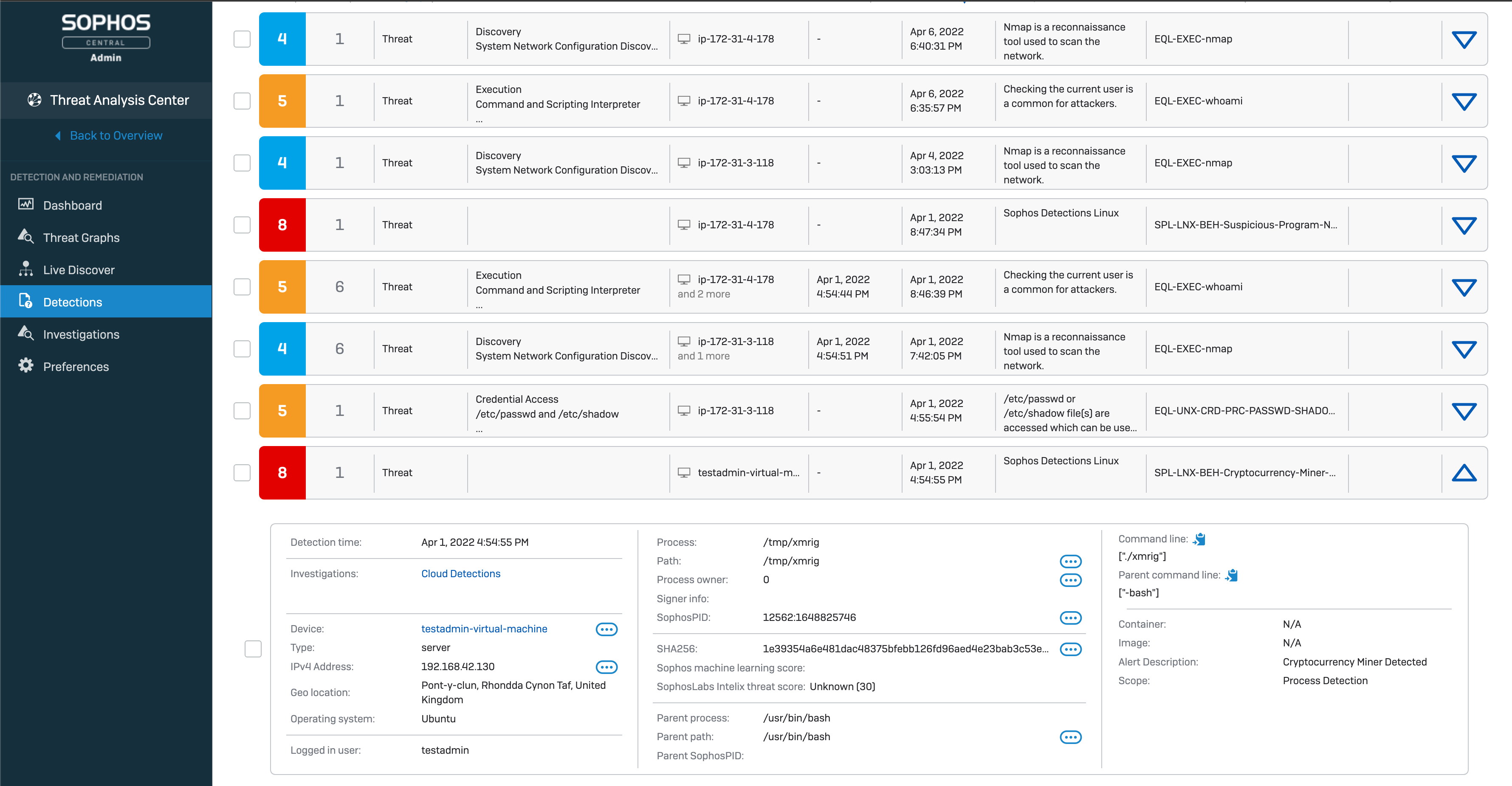 Un esempio di rilevamenti per Sophos Linux e container include: