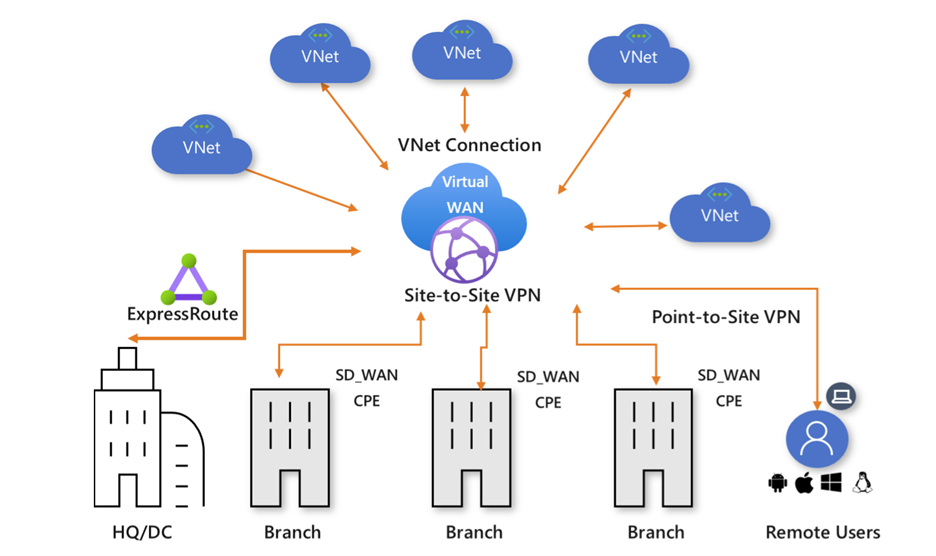 Azure Virtual WAN è un servizio di rete che riunisce molte funzionalità di rete, sicurezza e routing per fornire un’unica rete SD-WAN operativa. L’architettura WAN virtuale è un’architettura hub e spoke, con scalabilità e prestazioni integrate per filiali (dispositivi VPN / SD-WAN), utenti (client Azure VPN / OpenVPN / IKEv2), circuiti ExpressRoute e reti virtuali.