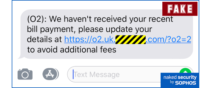 Of course, you should spot that this message is fraudulent because even though the left-hand end of the website name in the clickable link looks realistic (o2.uk), it’s the right-hand end of any domain name that determines the owner.
