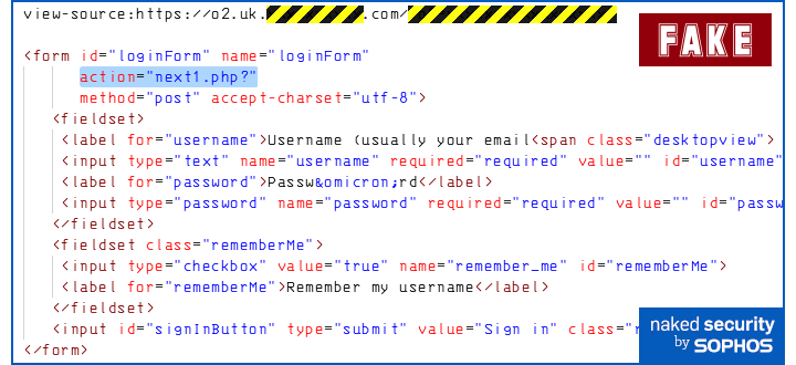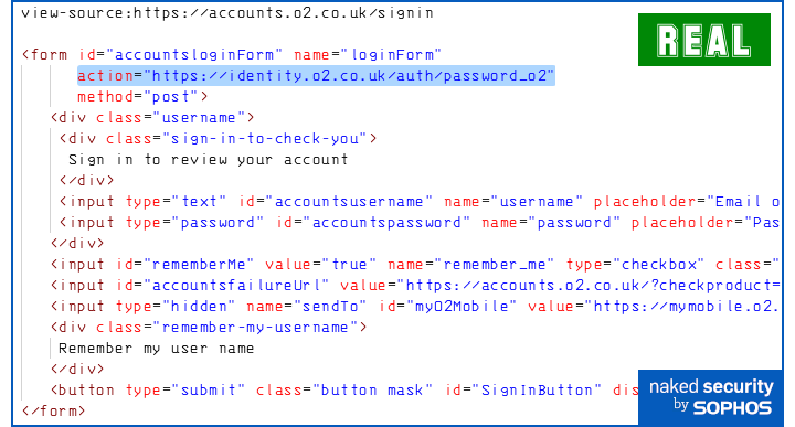 In comparison, the legitimate O2 sign-in page has a <form> tag like this: