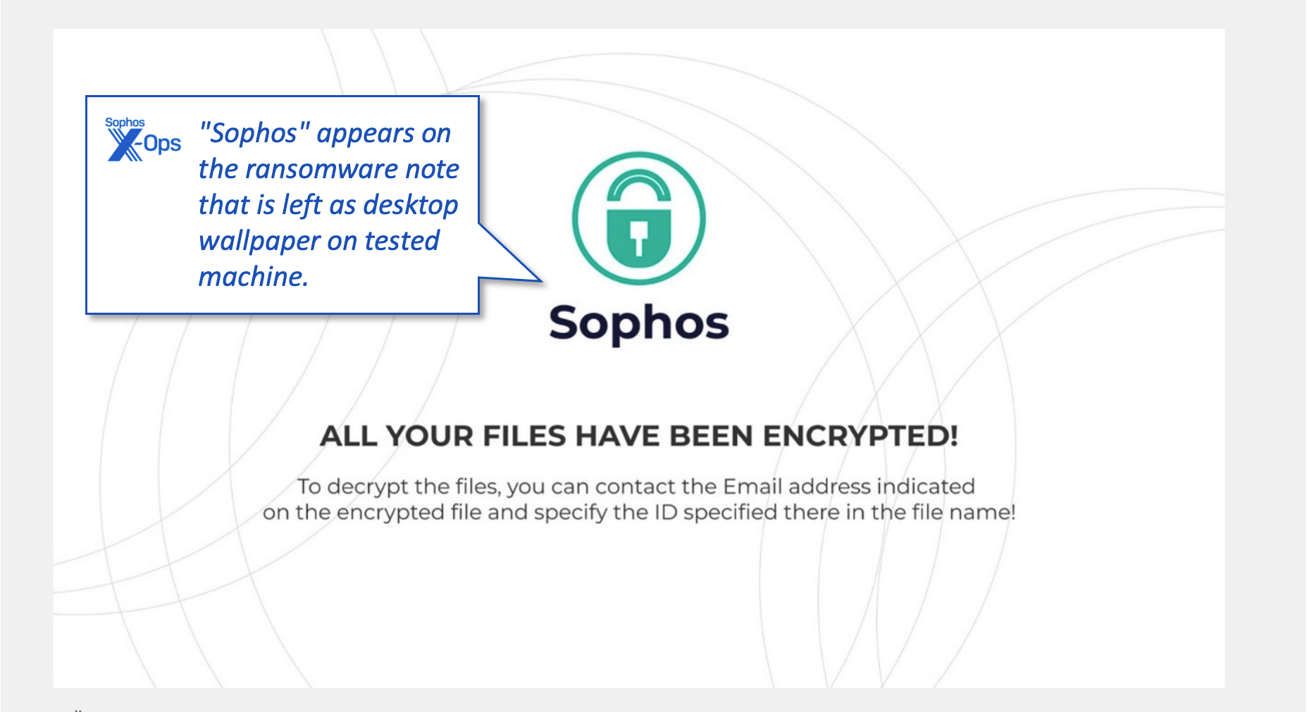 Il ransomware recupera anche una grafica da un sito web di libreria di immagini pubbliche e la utilizza per cambiare lo sfondo del desktop di Windows in una schermata con la scritta “Sophos”. È degno di nota il fatto che l’immagine non riproduca i loghi, i colori o il marchio di Sophos, ma presenti invece il logo di un lucchetto verde e le istruzioni su come l’obiettivo possa trovare e utilizzare la nota di riscatto per contattare gli aggressori.