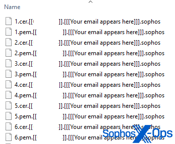 Il ransomware aggiunge a ogni file che codifica alla fine del processo un identificativo univoco della macchina, l’indirizzo e-mail inserito durante l’installazione e il suffisso “.sophos”.