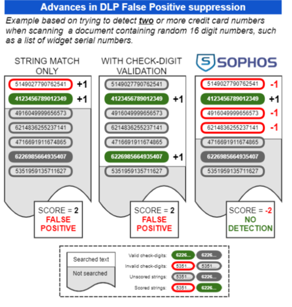 Il nostro approccio, Sophos DLP con punteggio negativo, considera non solo i risultati dei pattern match con cifre di controllo valide, ma anche il 90 per cento dei pattern match casuali con cifre di controllo non valide.