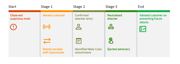 - Dopo soli 30 minuti i SophosLabs hanno confermato che un cybercriminale aveva ottenuto l’accesso all’ambiente dei clienti e che le tattiche, le tecniche e le procedure (TTP) dell’avversario corrispondevano alle prime fasi di un attacco ransomware Cuba