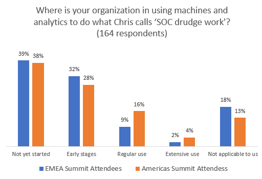 Chris Kissel, Research Director at IDC explored different ways that organizations can take advantage of machines and analytics to carry out what he called ‘SOC drudge work’. 20% of poll respondents are already using machines and analytics regularly or extensively to reduce the burden on human operators, while a further 28% are in the early stages.