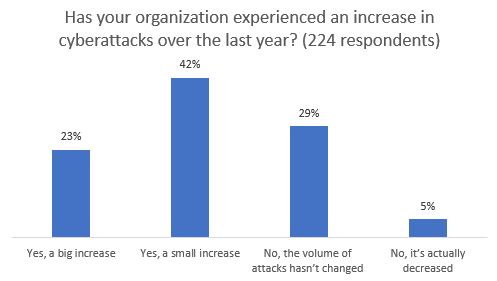 Two thirds (66%) of attendees said the number of cyber attacks on their organization increased over the last year, and just 5% experienced a reduction in attacks.